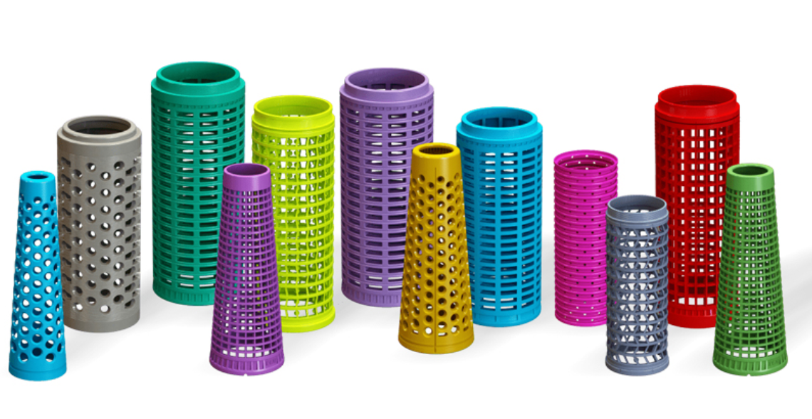 Más de 250 diseños con dibujos y tratamientos superficiales adecuados a las exigencias de los distintos tipos de hilado y/o fibras, fabricados en Polipropileno para uso estándar hasta 85°C, Polipropileno para alta temperatura hasta 120°C para vaporizados, y en otros plásticos especiales para altas temperaturas.